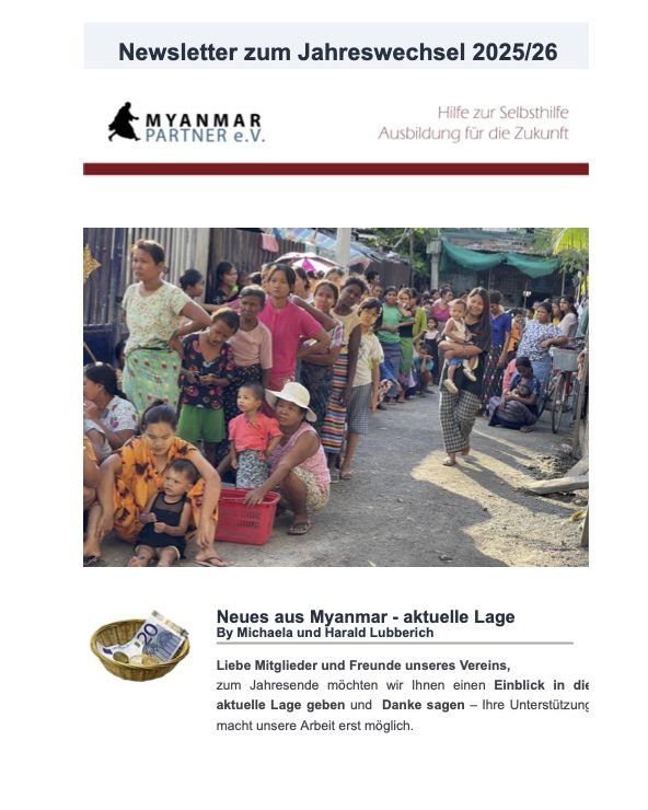 Wir, Myanmar-Partner e.V., setzen uns ehrenamtlich für schulische (Aus- & Fort)-Bildung in Myanmar ein, vermitteln Patenschaften, unterstützen durch Spenden u.a. die Phaung Daw Oo Klosterschule in Mandalay und kooperieren mit Ausbildungszentren in Deutschland.
