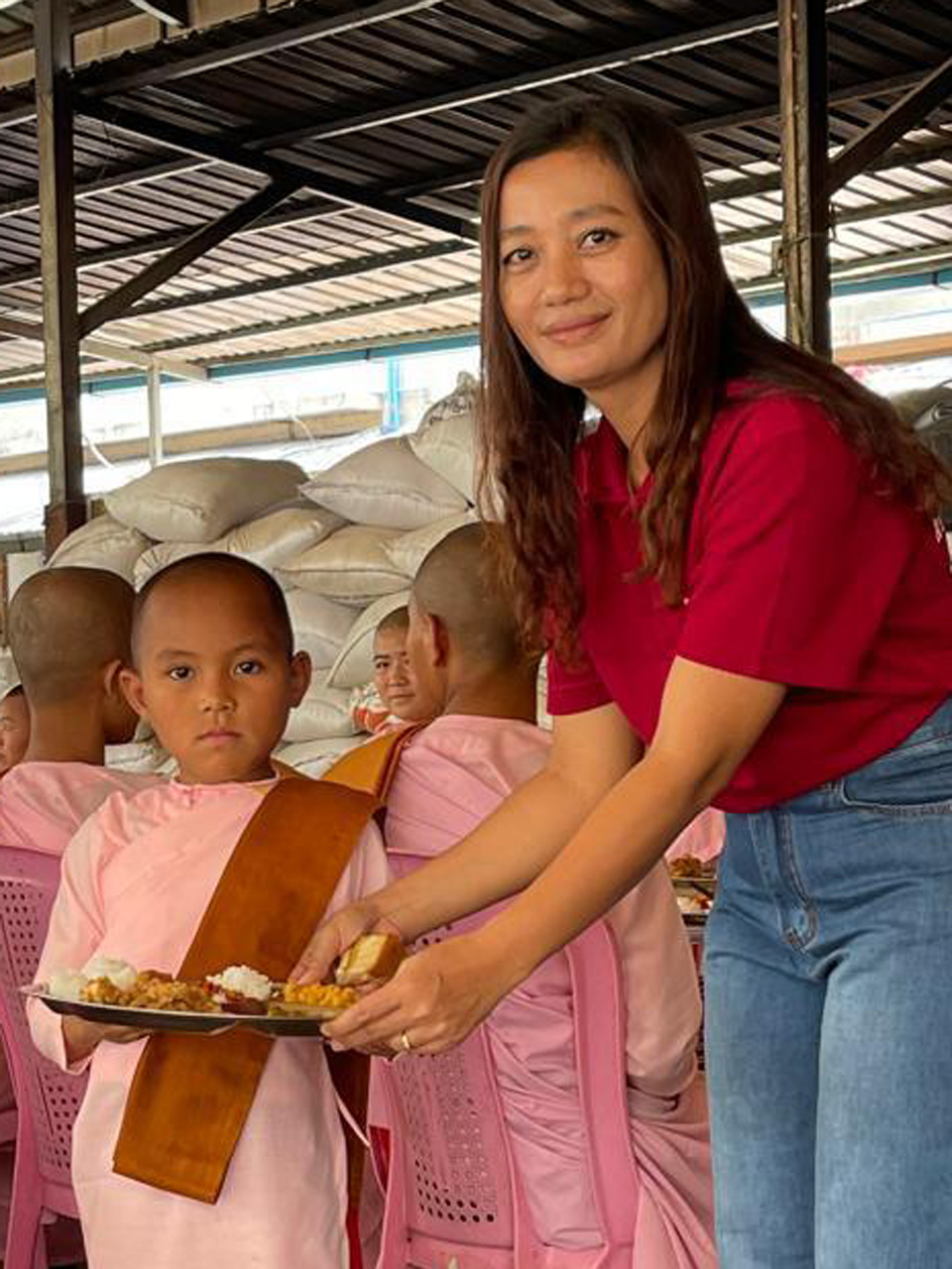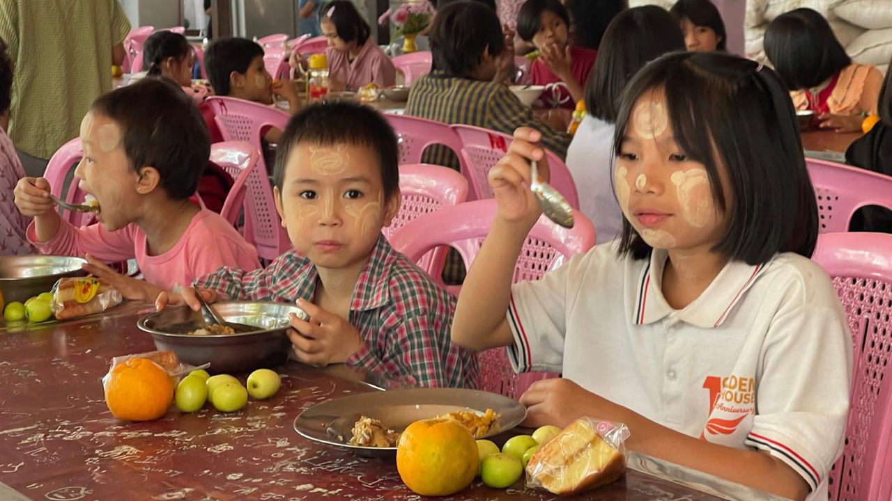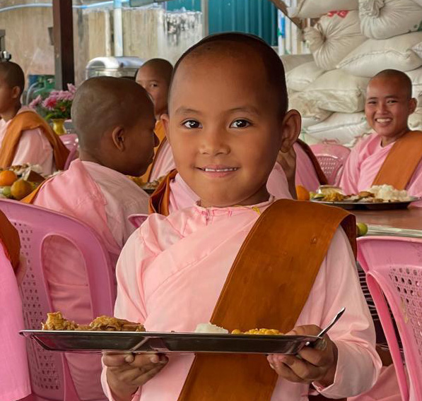 Unser besonderer Dank gilt Thandar, Nay Zaw und Sandar, die sich tagelang mit dem Einkauf der Geschenke und der Lebensmittel beschäftigt haben. Ihr unermüdlicher Einsatz und ihre Hingabe haben maßgeblich dazu beigetragen, dass das Fest zu einem besonderen Erlebnis wurde. Sie alle haben zusammen mit unserer Deutsch-Klasse in Myanmar dafür gearbeitet, dass die Kinder und alle Bewohner der PDO auch in diesem Jahr ein unvergessliches Weihnachten erleben durften. Alle Bewohnerinnen und Bewohner – Mönche, Novizen, Nonnen, Waisenkinder und Mitarbeitende – erhielten ein vollständiges Festessen mit Gemüse, Hühnchen und Obst. Nicht nur Reis wie sonst, sondern ein Mahl, das Gemeinschaft und Wertschätzung spürbar machte. Jedes Waisenkind durfte sich zudem über einen warmen Pullover freuen. Die Freude war groß – und tief berührend.